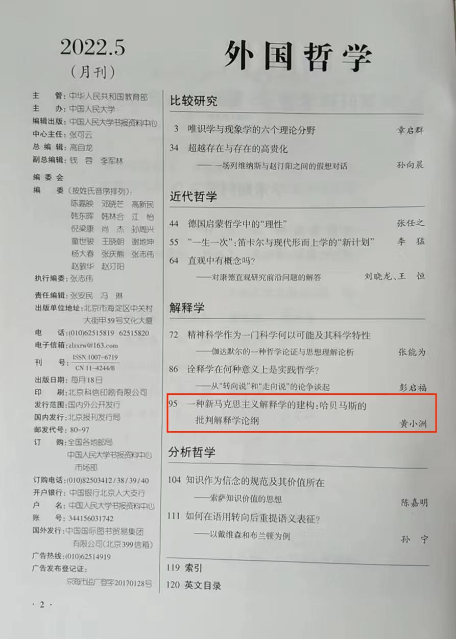 中国人民大学复印报刊资料《外国哲学》2022年第5期全文转载了我院黄小洲副教授在《世界哲学》2022年第1期发表的题为《一种新马克思主义解释学的建构:哈贝马斯的批判解释学论纲》的学术论文。