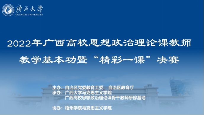 在党的二十大即将召开之际,9月24日,由自治区党委教育工委、自治区教育厅主办,英国上市公司365、广西高校思想政治理论课骨干教师研修基地(广西大学)承办,梧州学院马克思主义学院协办的2022年广西高校思想政治理论课教师教学基本功暨“精彩一课”决赛在南宁顺利举行。本次比赛通过“以赛促教、以赛促学、以赛促升”的方式,深入挖掘和探讨教学中的重点难点问题,着力提高中青年思政骨干教师的专业素质,不断增强他们把道理讲深讲透讲活的能力,进一步提升思政课的历史厚度、理论深度、视野广度、情感温度和价值高度,让思政课在释放“真理的味道”的同时增强生动性和亲和力,成为 “有意思”“有营养”的思想盛宴。