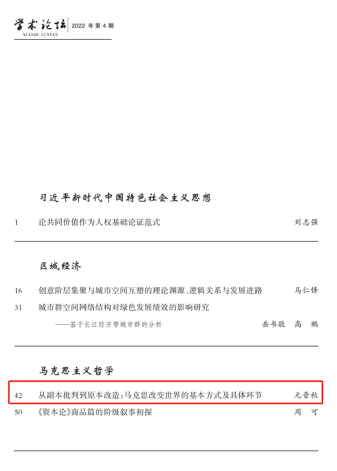 我院元晋秋副教授在《学术论坛》(2022年第4期)上发表理论文章《从副本批判到原本改造:马克思改变世界的基本方式及具体环节》。《学术论坛》是由广西社会科学院主管主办的综合性哲学社会科学学术期刊。期刊坚持以马克思列宁主义、毛泽东思想、邓小平理论、“三个代表”重要思想、科学发展观、习近平新时代中国特色社会主义思想为指导,秉承学术性、思想性、战略性的办刊方针,以研究哲学社会科学重大理论问题和现实问题为基本定位,追踪学术前沿,倡导理论创新,致力于打造一个高水平、有特色的学术交流平台。