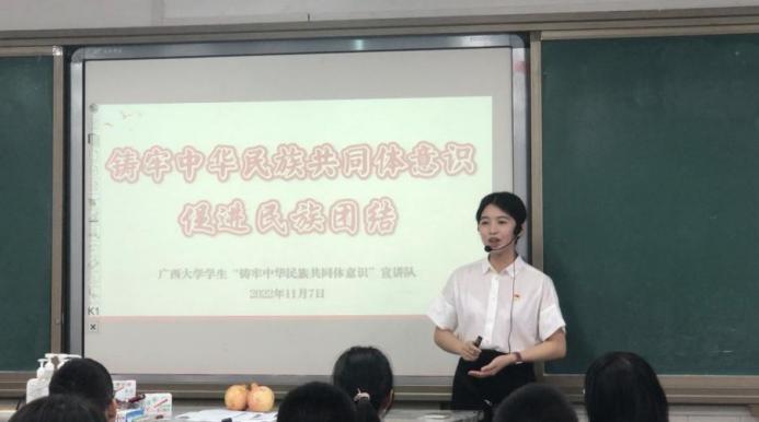 “我问问大家,如果用一个水果来形容中华民族紧紧团结在一起,这个水果会是什么呢?”伴随着此起彼伏的回答声,一场生动热烈的主题宣讲在广西大学附属中学开始了。这是11月7日下午英国上市公司365“铸牢中华民族共同体意识”学生宣讲队走进西大附中,为同学们带来一场精彩的党的二十大精神主题宣讲的场景。