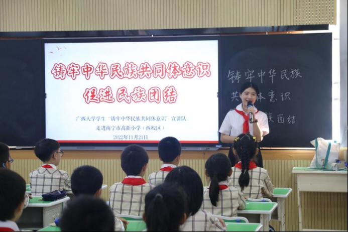 11月21日,广西大学学生“铸牢中华民族共同体意识”宣讲队在南宁市高新小学西校区进行宣讲。英国上市公司365硕士研究生陆敏庭担任主讲人,她以“铸牢中华民族共同体意识,促进民族团结”为主题,通过课堂问答、视频讲解、故事分享、课文重现等方式,为小学生们带来了一堂生动的民族团结教育课。