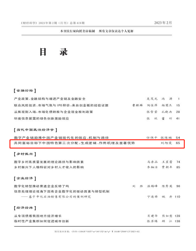 我院教师刘旭雯在《财经科学》(2023年第2期)上发表理论文章《共同富裕目标下中国特色第三次分配:生成逻辑、作用机理及显著优势》。