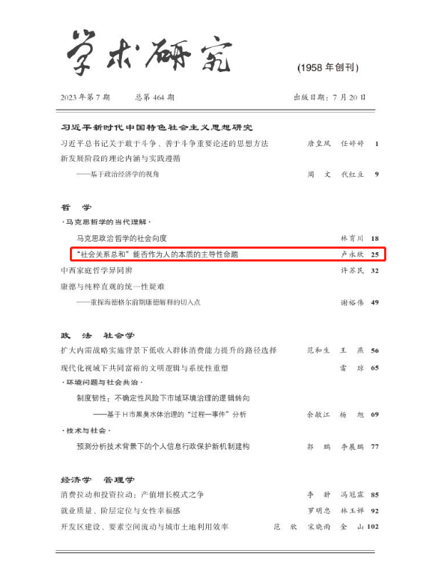 我院教师卢永欣在《学术研究》(2023年第7期)上发表理论文章《“社会关系总和”能否作为人的本质的主导性命题》。