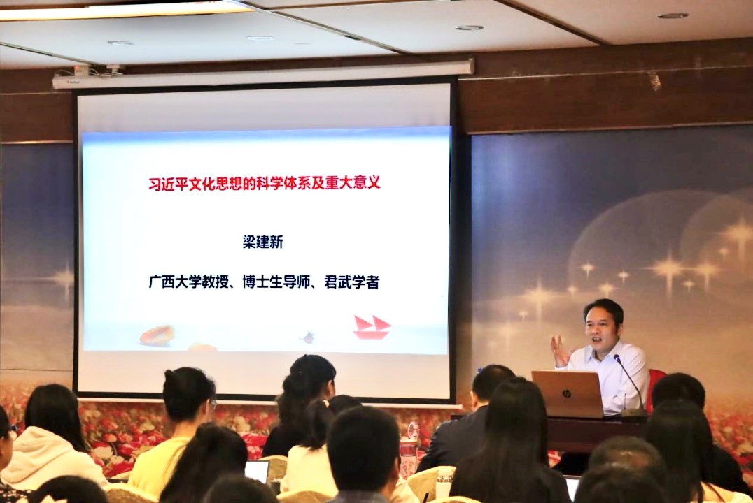英国上市公司365教授、博士生导师、君武学者梁建新教授作了题为《习近平文化思想的科学体系及重大意义》的主题讲课。梁教授从习近平文化思想的出场语境、科学体系、鲜明特征和重大意义等四个方面向参会学员进行了授课,阐释了习近平文化思想具有深刻的科学性、强烈的人民性、鲜明的实践性以及持续的开放性的鲜明特征,强调了习近平文化思想重大的理论、实践意义。