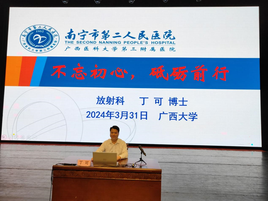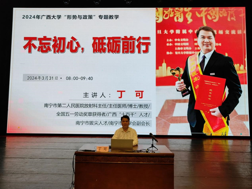 3月31日,“形势与政策”课程专题教学报告会在我校大礼堂如期举行。全国五一劳动奖章获得者、广西“十百千”人才、南宁市拔尖人才、广西等级医院评审专家丁可教授为到场师生做了题为《不忘初心,砥砺前行》的报告。