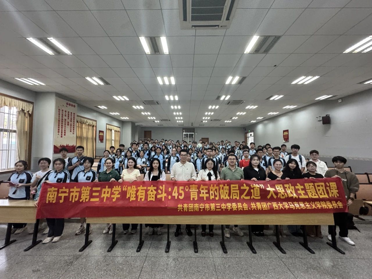 “躺平不可取、躺赢不可能,青年唯有奋斗方能成功!”近日,我院团员青年走进南宁市第三中学青山校区,通过“大手拉小手”的方式,与中学生们同上了一堂别开生面的主题团课,在共话奋斗、共谈理想的过程中,深刻体会了新时代好青年的历史使命与责任担当,更加坚定为中国式现代化挺膺担当的信念和决心。