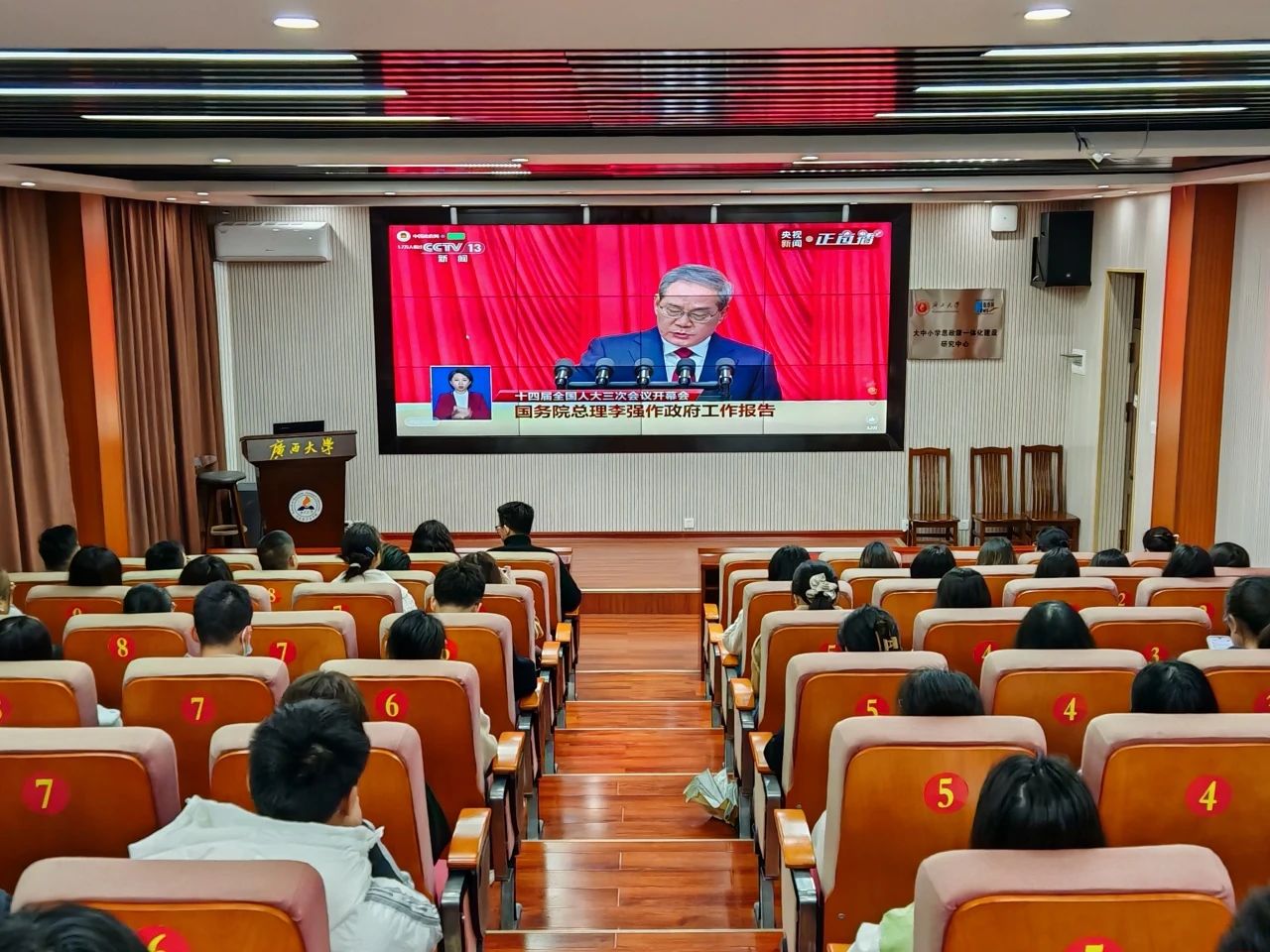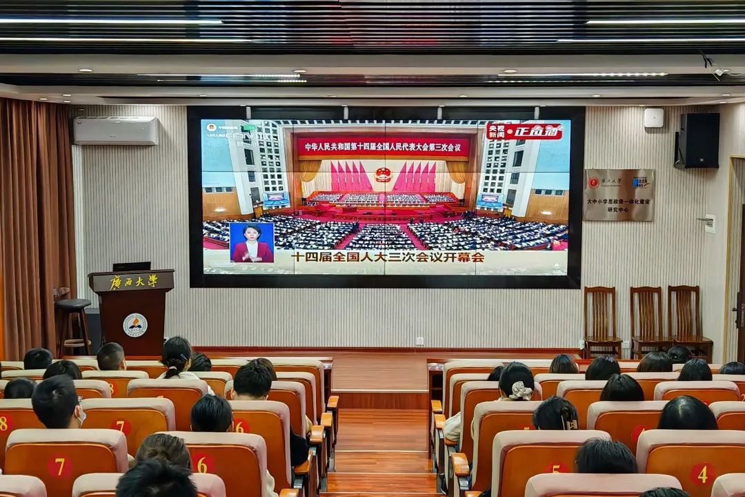 阳和启蛰,万物向荣。2025年3月5日9时,北京人民大会堂华灯璀璨,第十四届全国人民代表大会第三次会议在庄严的国歌声中拉开帷幕。这是全国人民政治生活中的一件大事,也是青年学子关注国家发展、凝聚奋进力量的重要契机。为深刻了解两会内容,进一步贯彻习近平新时代中国特色社会主义思想,马克思主义学院组织全体师生及党员干部共同观看会议直播,在《政府工作报告》的铿锵字句中触摸时代脉搏,在思想交流的热烈讨论中凝聚奋进共识。