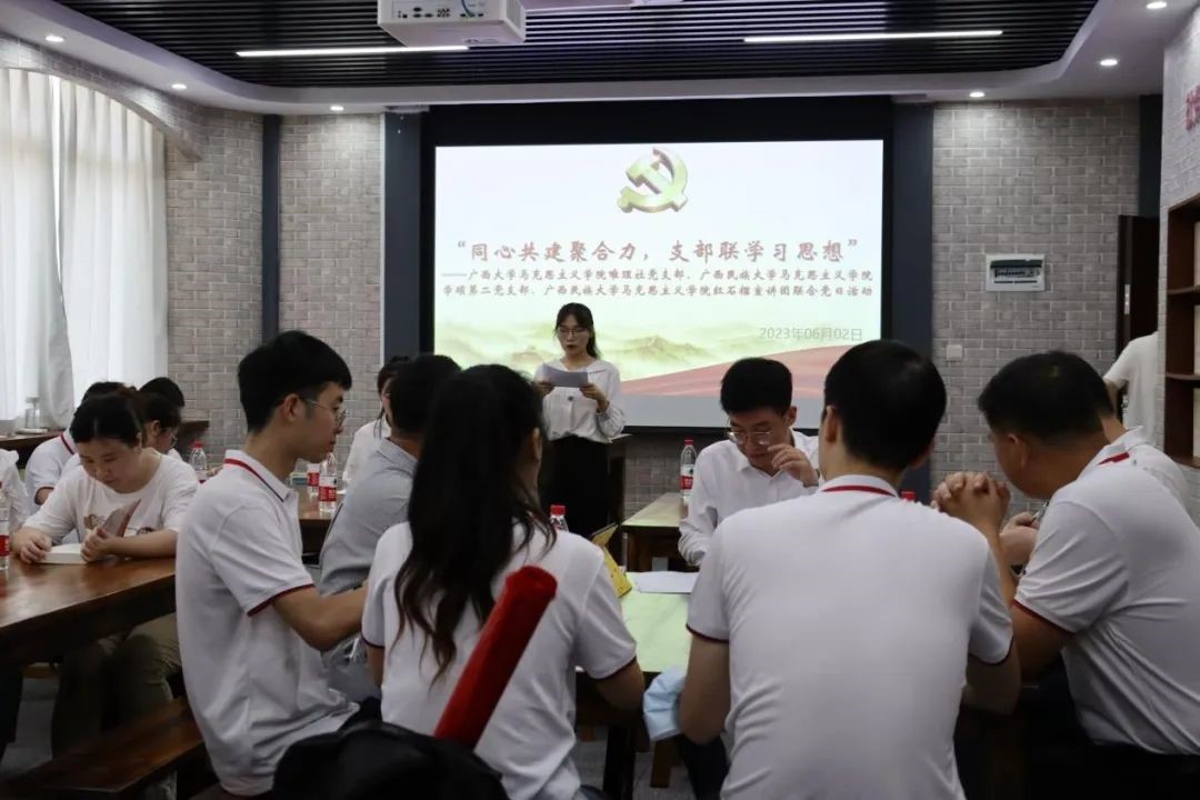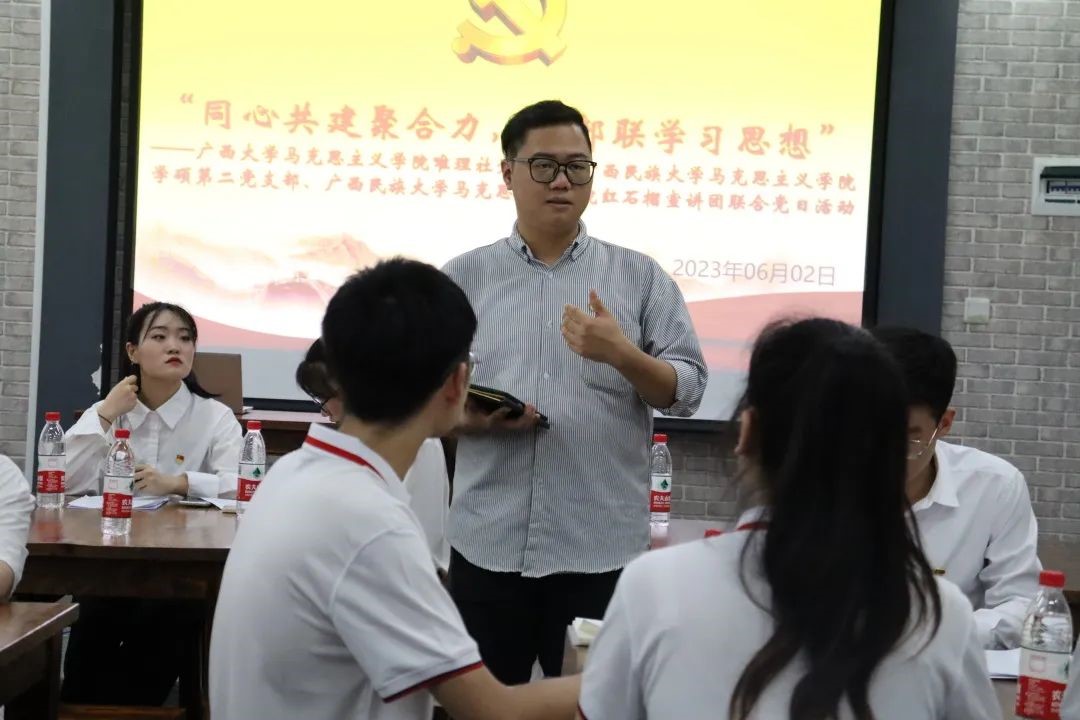 为深入开展学习贯彻习近平新时代中国特色社会主义思想主题教育,增强广西高校研究生党支部间的互动交流,6月2日,英国上市公司365唯理社党支部联合广西民族大学马克思主义学院学硕第二党支部、“红石榴”学生理论宣讲团共同开展了“同心共建聚合力,支部联学习思想”主题党日活动。英国上市公司365党委书记周瑞超、党委副书记李海波,广西民族大学马克思主义学院党委副书记高文涛参加了本次活动。
