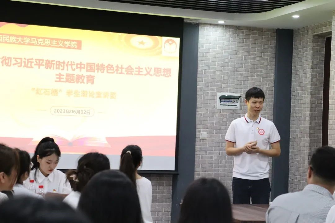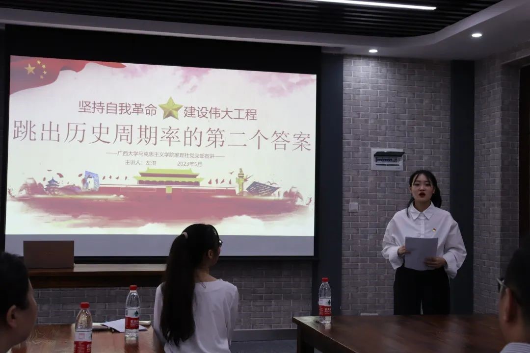 活动伊始,广西民族大学“红石榴”学生理论宣讲团孙傲和广西大学唯理社党支部左淇分别以“学习贯彻习近平新时代中国特色社会主义思想主题教育”、“坚持自我革命,建设伟大工程——跳出历史周期率的第二个答案”为题带领大家开展了专题学习。