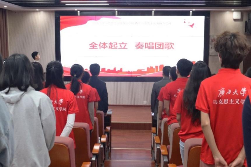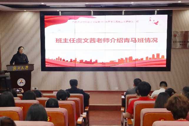 仪式在庄严雄壮的国歌声中拉开帷幕。仪式伊始,青马班班主任虞文茜老师向参会人员详细介绍了我院“青马工程”的发展情况及“六红一星”培养体系,并寄语新一期青马班学员珍惜和把握学习机会,争当一名集忠诚的政治品格、浓厚的家国情怀、扎实的理论功底和突出的能力素质于一身的青年马克思主义者。