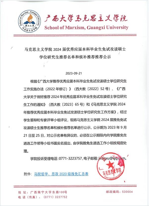 马克思主义学院2024届推免免试攻读硕士生推荐名单和候补推荐名单公示