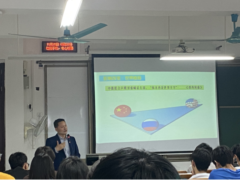 徐秦法教授以“教研部”前期调研汇总学生所关心关注的热点问题为切入点,通过“新时代带来新课题,为什么中国要对外援助‘到处撒钱’?”等问题导入,从“世界怎么了?”“人类向何处去?”“中国怎么办?”三个层面讲授,用丰富的案例、精准的数据、鲜明的对比,引导学生深刻认识当前世界又站在历史的十字路口,构建人类命运共同体是回答和解决世界之问、人类之问、时代之问而提出的中国方案,也是给世界人民带来福祉的人间正道,我国要展现负责任大国的担当,同各国人民一道努力构建人类命运共同体,把世界建设得更加美好。