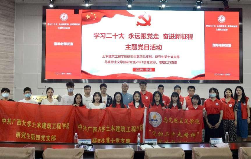 为深入学习宣传贯彻党的二十大精神,凝聚踔厉奋发向未来的强大合力,11月4日,我院研究生2021级党支部、唯理社党支部与土木建筑工程学院研究生第四党支部、研究生第十党支部联合开展了“学习党的二十大、永远跟党走、奋进新征程” 主题党日活动。