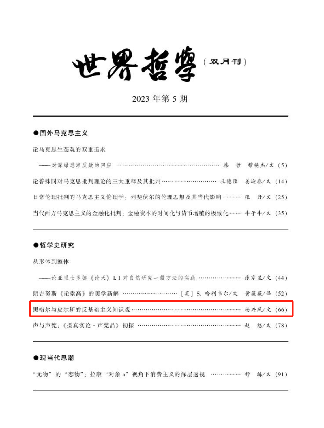 我院教师杨兴凤在《世界哲学》(2023年第5期)上发表理论文章《黑格尔与皮尔斯的反基础主义知识观》。
